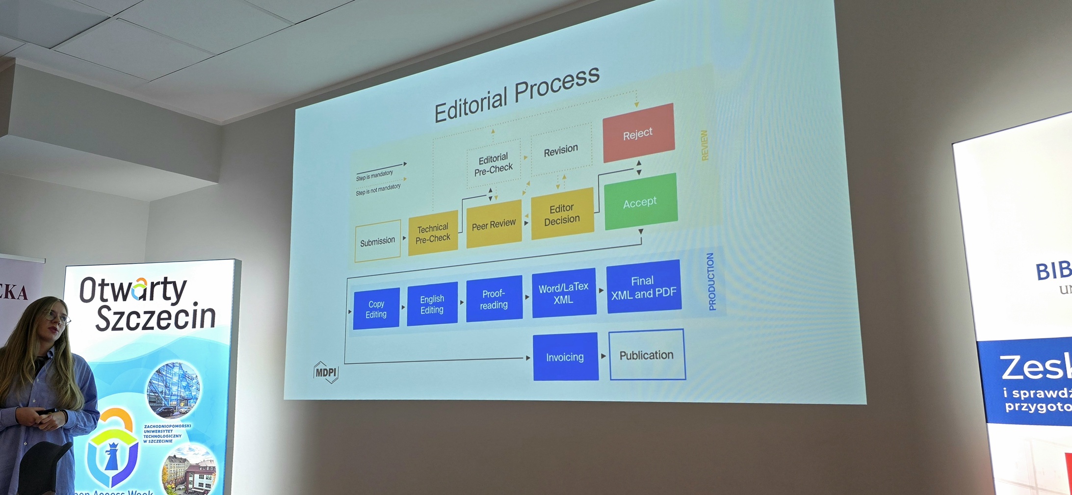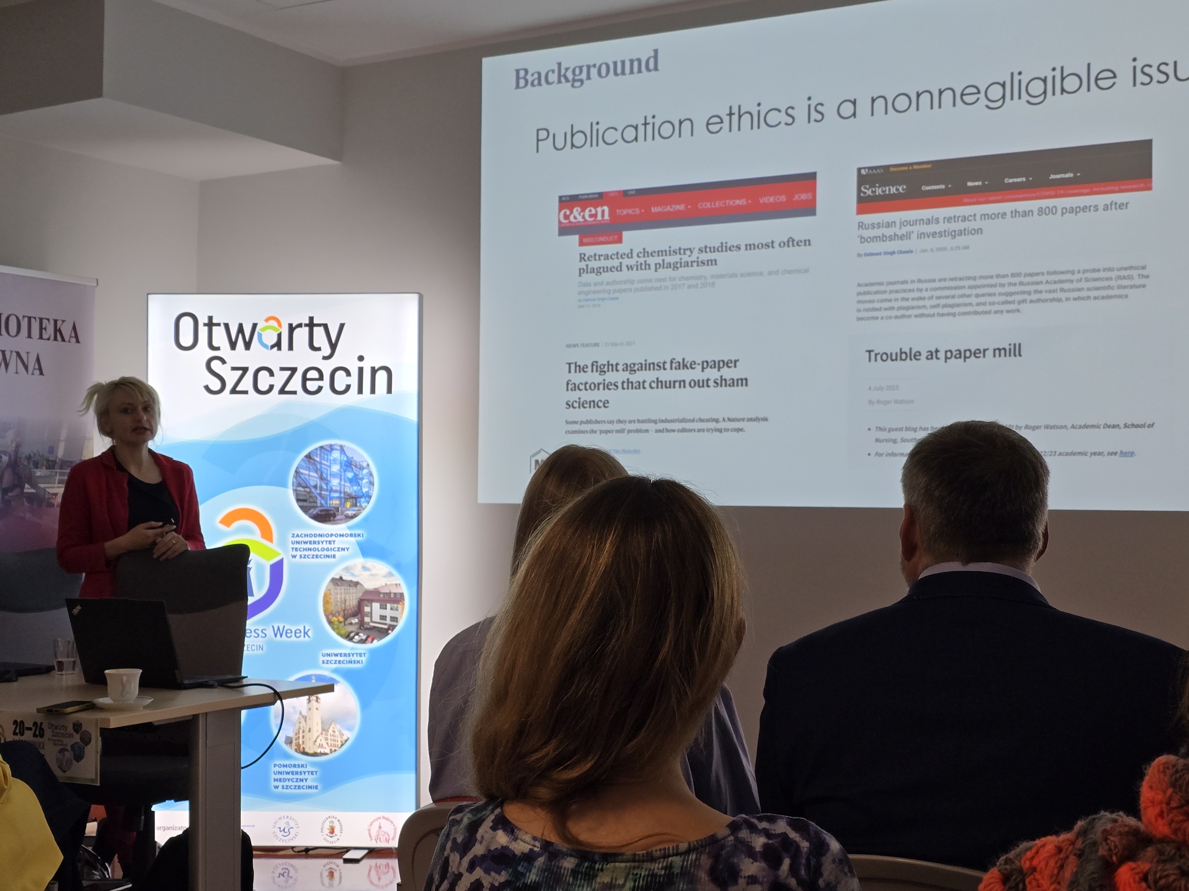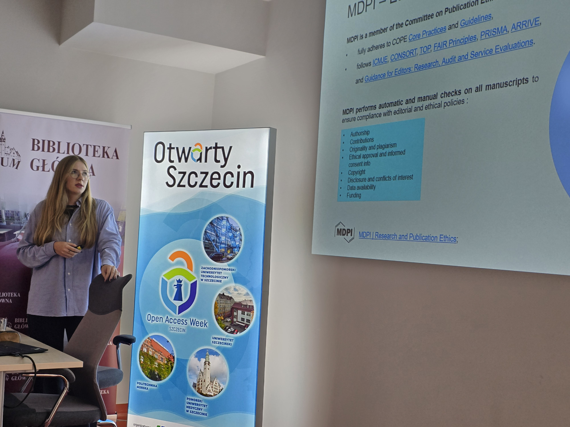 Tydzień Otwartej Nauki został w Szczecinie zainicjowany przez Zachodniopomorski Uniwersytet Technologiczny. Podczas wydarzenia zaprezentowane zostało wystąpienie pana Marcina Kapczyńskiego z firmy Clarivate „Otwartość a ryzyko nadużyć: jak rozpoznać i unikać nierzetelnych źródeł?”, które miało na celu wskazanie ciemniejszej strony Otwartej Nauki oraz wypracowanie umiejętności wyboru wyłącznie rzetelnych i wiarygodnych źródeł, m.in. z wykorzystaniem serwisu Web of Science oraz Master Journal List. Następnie uczestnicy mieli okazję wysłuchania panelu dyskusyjnego „Wyzwania naukowca w świecie publikacji: między otwartością a ryzykiem nierzetelnych praktyk”, który pozwolił na skonfrontowanie opinii dotyczących otwartego dostępu do publikacji naukowych i danych badawczych pracowników naukowych reprezentowanych przez prof. dr. hab. inż. Karola Fijałkowskiego, prorektora ds. nauki i współpracy międzynarodowej ZUT oraz dr. inż. kpt. ż.w. Arkadiusza Tomczaka, prof. PM, bibliotekarzy: mgr. Ireneusza Bojanowskiego, zastępce dyrektora Biblioteki Głównej US oraz mgr. Tomasza Nowocienia, specjalistę ds. danych badawczych i otwartej nauki z Działu Informacji Naukowej i Bibliografii Biblioteki Głównej PUM, oraz przedstawicieli wydawnictw i instytucji eksperckich Annę Krakówkę i Monikę Mazurek z wydawnictwa MDPI oraz Marcina Kapczyńskiego z firmy Clarivate. Pierwszy dzień zakończył się warsztatami prowadzonymi przez przedstawicielki wydawnictwa MDPI „Publikowanie bez tajemnic – dobre praktyki w procesie wydawniczym MDPI”.