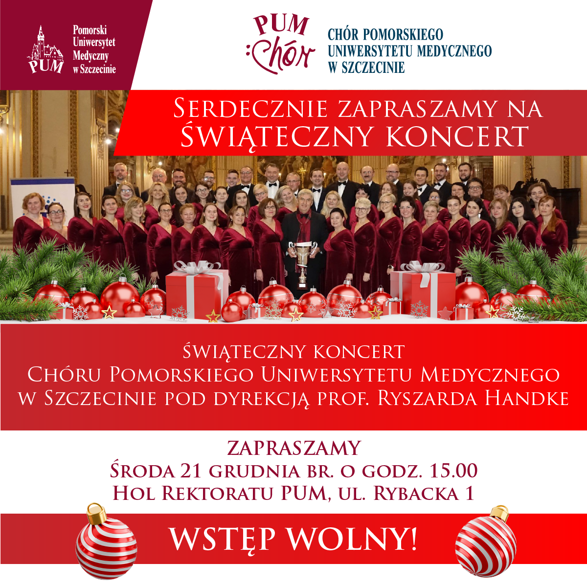 Serdecznie zapraszamy na świąteczny koncert Chóru PUM, który odbędzie się 21 grudnia br. o godz. 15.00 w holu Rektoratu Pomorskiego Uniwersytetu Medycznego w Szczecinie.