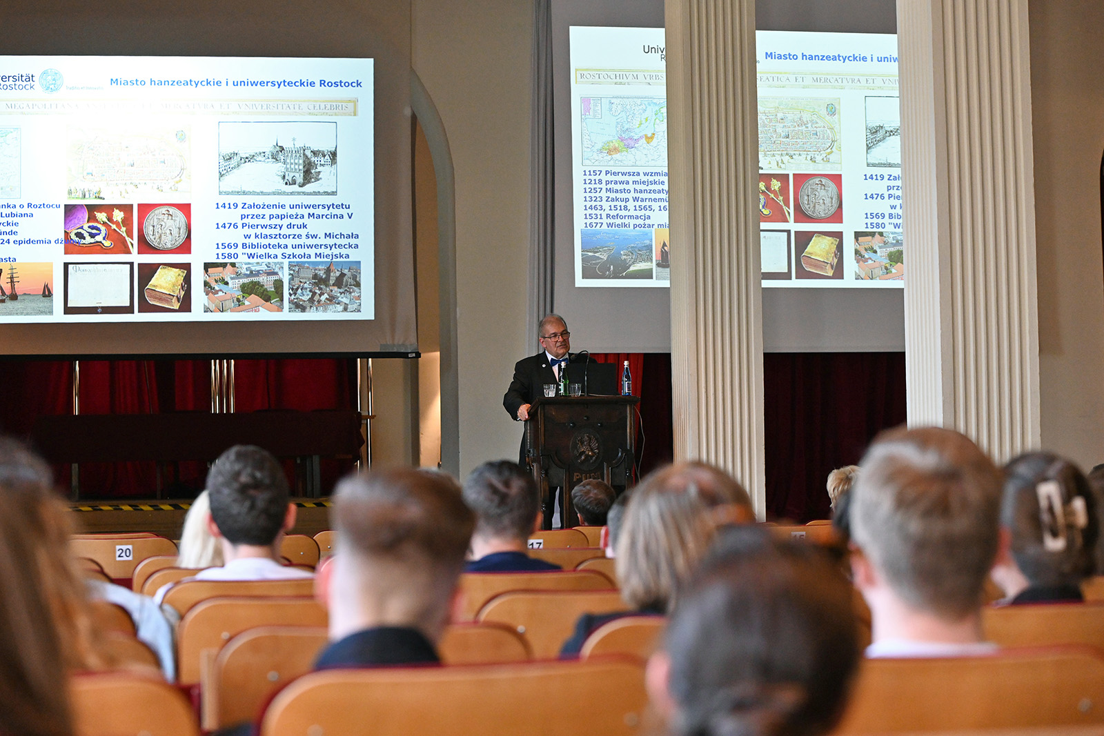 Wykład otwarty prof. Wolfganga Scharecka pt. Can higher education make you happier? - Czy wykształcenie wyższe może uczynić Cię szczęśliwszym? odbył się 10 maja 2023 r. i stanowił ważne wydarzenie dla całej społeczności Uniwersytetu, szczególne dla młodzieży akademickiej. Spotkanie z wielkim naukowcem, o doświadczeniu płynącym również z lat budowania tradycji Uniwersytetu w Rostocku, odbyło się w niezwykle przyjaznej atmosferze i stanowiło okazję dla młodych naukowców i przyszłych klinicystów, którzy mogli wysłuchać inspirującego wykładu oraz zadać pytania wybitnemu Gościowi.