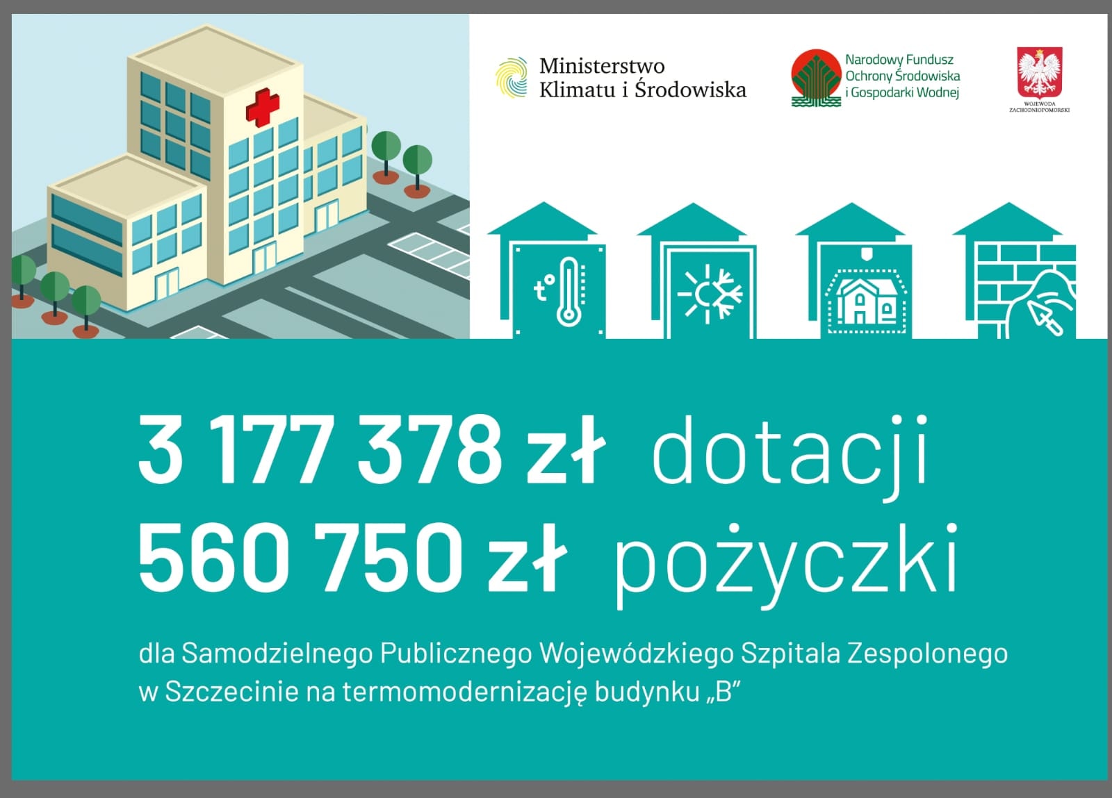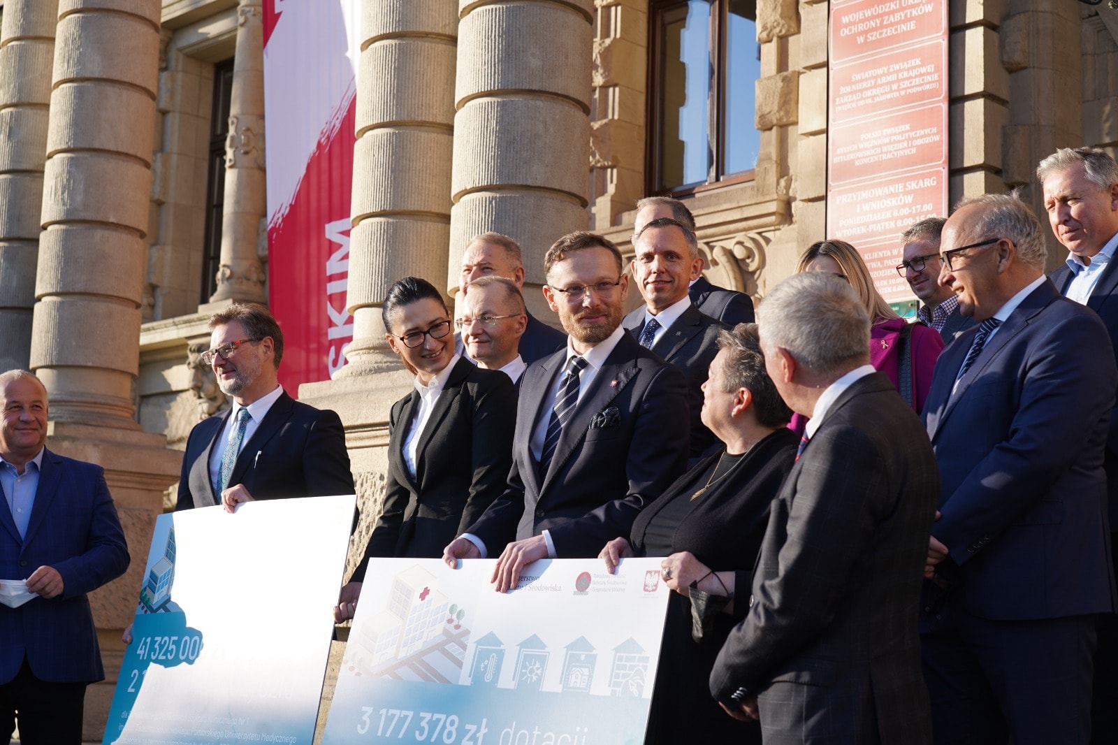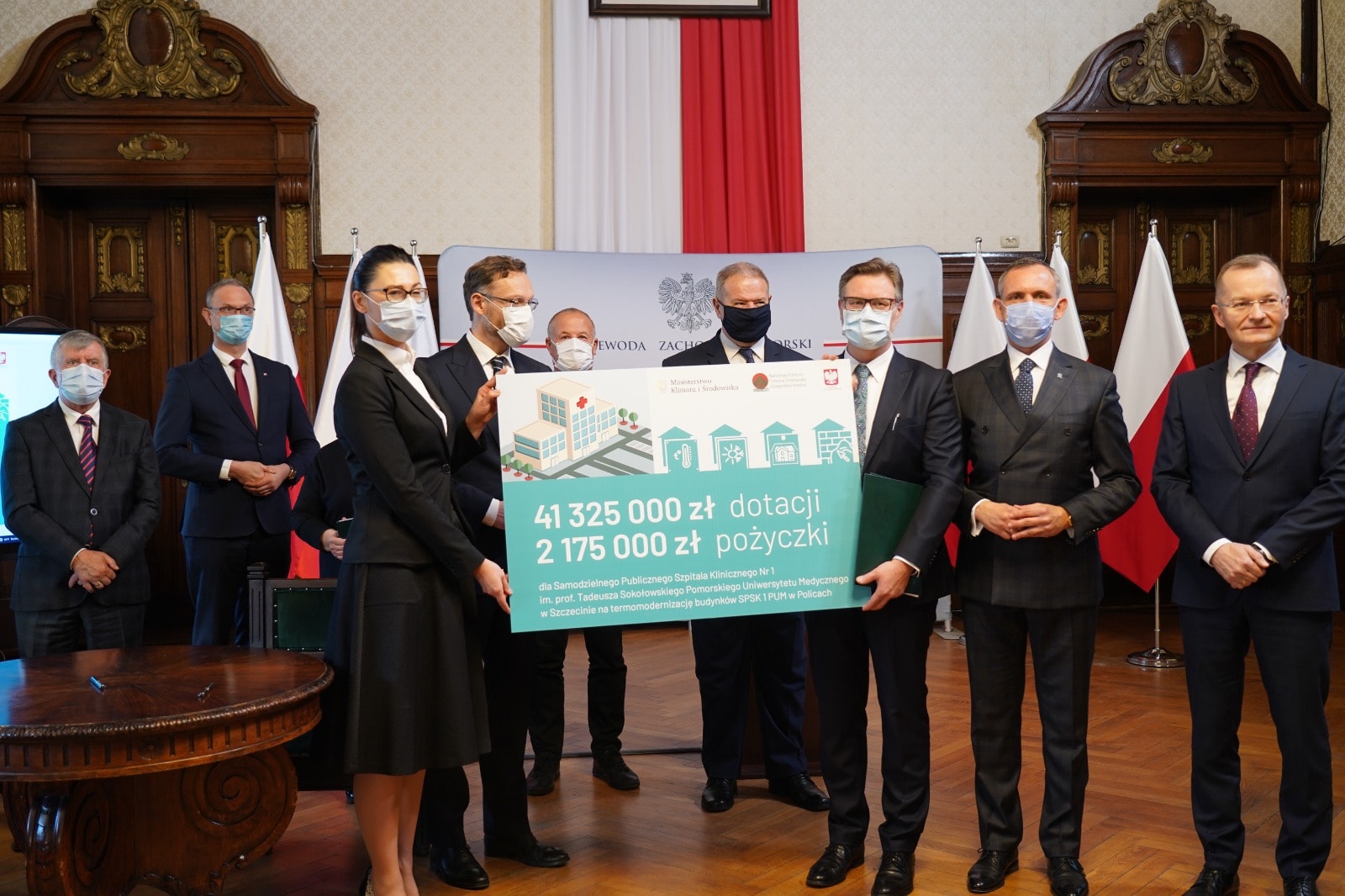 Dotację na termomodernizację w wysokości 6 mln złotych otrzymał także Samodzielny Publiczny Wojewódzki Szpital Zespolony w Szczecinie. Obie umowy zostały podpisane 20 grudnia 2021 r. w Zachodniopomorskim Urzędzie Wojewódzkim w Szczecinie. W uroczystości uczestniczyli wiceprezes NFOŚiGW Paweł Mirowski, wiceminister w Ministerstwie Klimatu i Środowiska Małgorzata Golińska, posłowie Leszek Dobrzyński, Michał Jach i Artur Szałabawka, wojewoda zachodniopomorski Zbigniew Bogucki i wicewojewoda Tomasz Wójcik, a także beneficjenci dofinansowania – dyrektor SPWSK Małgorzata Usielska i dyrektor SPSK-1 PUM Konrad Jarosz wraz z rektorem PUM prof. Bogusławem Machalińskim.
