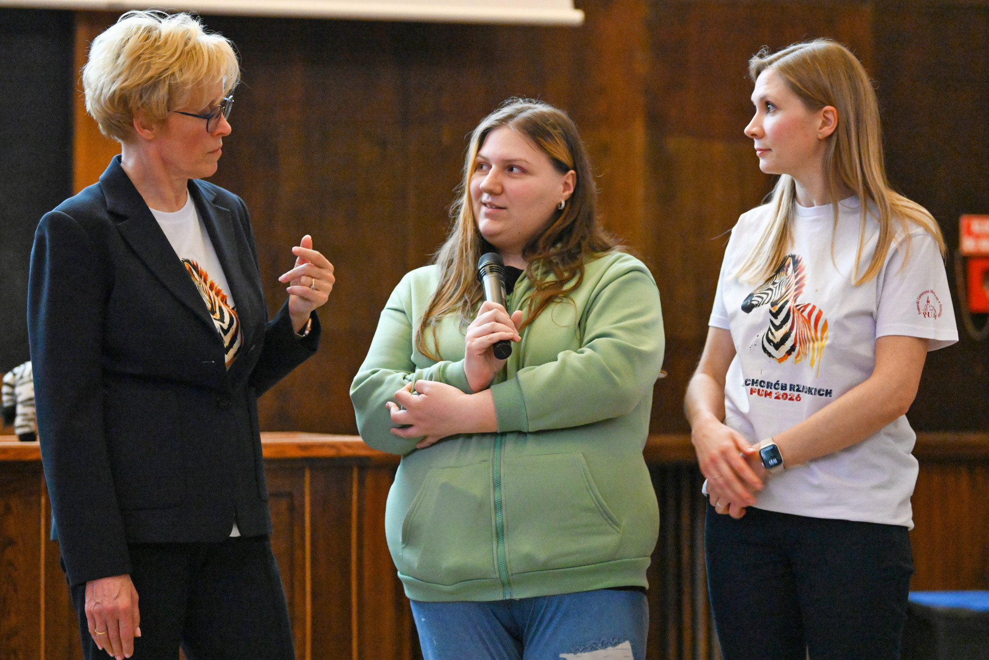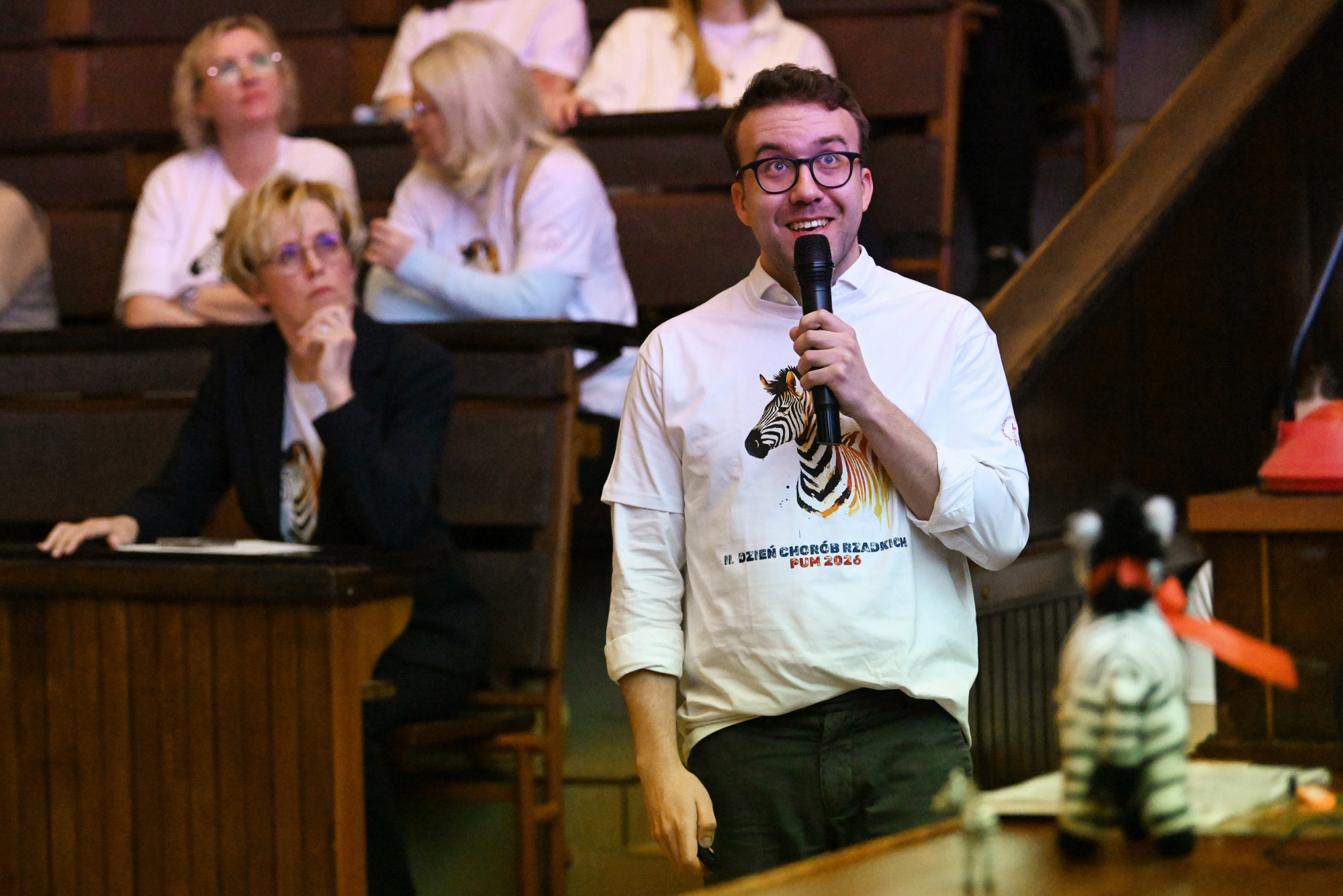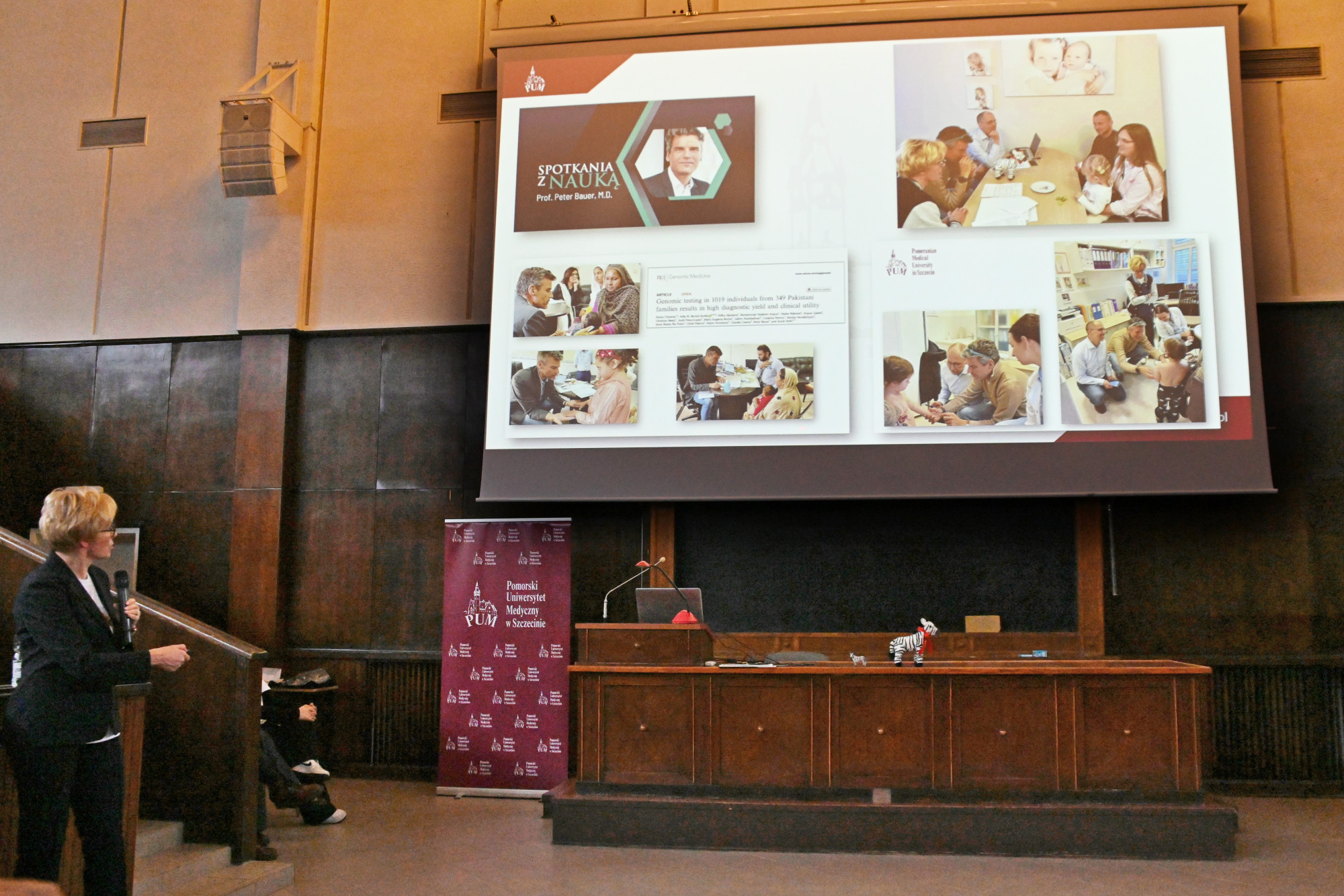 O kilku „małych zebrach” będących pod opieką Kliniki Pediatrii, Chorób Rzadkich i Medycyny Metabolicznej PUM opowiedzieli kolejni prelegenci. Doktor Alicja Leśniak przedstawiła spektakularne efekty leczenia choroby Segawy, czyli bardzo rzadkiego defektu neurotransmisji u małego Marcela, doktor Iwona Ostrowska opowiedziała o terapii lekowej w achondroplazji, dr Michał Patalan zaprezentował przełom w leczeniu krzywicy hipofosfatemicznej u małego Dominika, student 6. roku kierunku lekarskiego PUM Ignacy Frulenko podzielił się wynikami 15 miesięcy obserwacji Ksawerego z niezwykłym zespołem genów przyległych. Zaproszonym wykładowcą była także dr med. Kaja Giżewska-Kacprzak z Oddziału Klinicznego Chirurgii Dziecięcej, Onkologicznej, Urologii i Chirurgii Ręki PUM, która przedstawiła ciekawe spojrzenie na chirurgię dziecięcą, jako chirurgię chorób rzadkich.