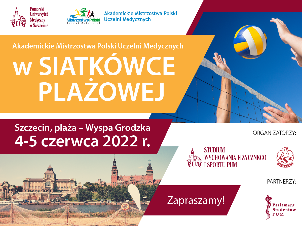 Tegoroczne Akademickie Mistrzostwa Polski Uczelni Medycznych w siatkówce plażowej kobiet i mężczyzn odbędą się od patronatem JM Rektora PUM prof. dr hab. n. med. Bogusława Machalińskiego. Zmagania młodych medyków organizowane są po raz ósmy, a Pomorski Uniwersytet Medyczny w Szczecinie po raz drugi prezentuje się w roli gospodarza. Turniej rozgrywany będzie systemem brazylijskim, co oznacza, że druga porażka eliminuje zespół z dalszej gry o tytuł Mistrza Polski, ale pozwoli grać o dalsze miejsca. Spotkania toczyć się będą równolegle na 4 profesjonalnych boiskach.