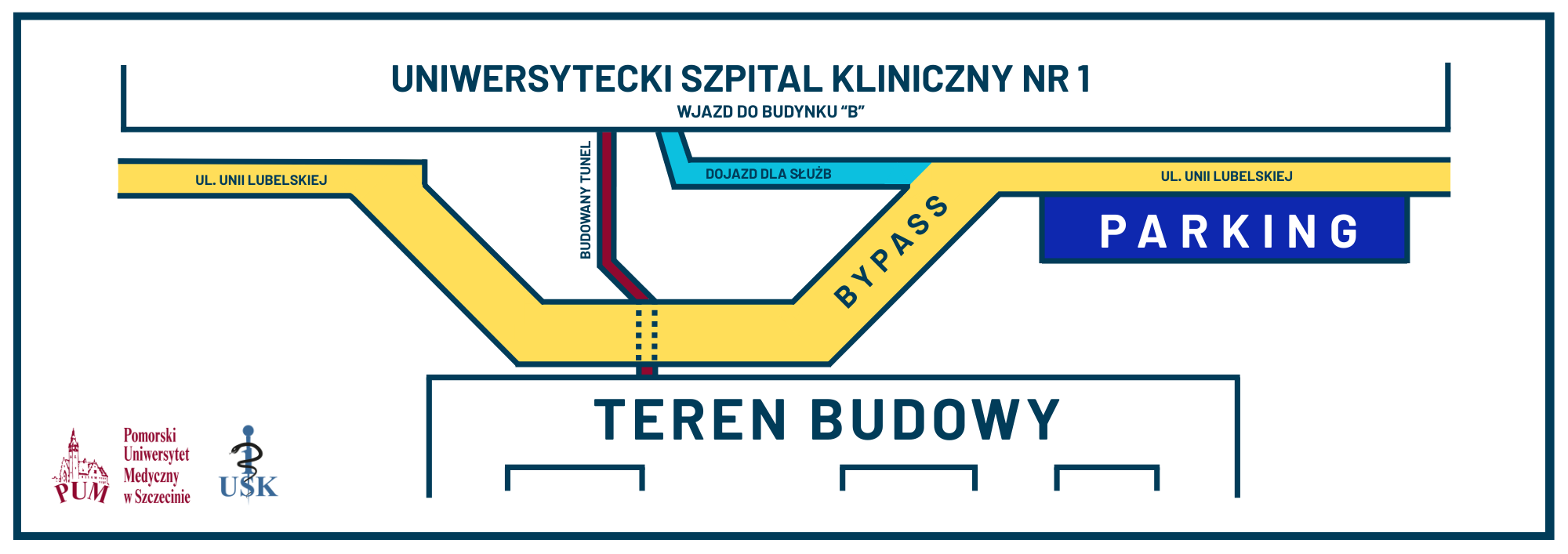 Budowa nowoczesnego kompleksu klinicznego i dydaktycznego to olbrzymie wyzwanie logistyczne. Prace przy stworzeniu konstrukcji budynku o łącznej powierzchni około 50 tys. m. kwadratowych zostały zaplanowane tak , aby w każdym czasie jego realizacji zapewnić pacjentom i mieszkańcom Szczecina maksymalnie najlepszy dostęp do komunikacji i parkingów Uniwersyteckiego Szpitala Klinicznego nr 1 PUM. W rozpoczynającym się etapie wybudowana zostanie druga część łącznika od strony szpitala, przebudowywane będą także instalacje podziemne. Połączenie Centrum ze Szpitalem zapewni specjalny podziemny korytarz, który znacznie ułatwi komunikację pomiędzy jednostkami, a to z kolei pozwoli m. in. na efektywniejsze leczenie pacjentów. Na potrzeby budowy podziemnego łącznika zajęta zostanie część terenu szpitala oraz pasa drogowego. 20 maja br. zamknięta zostanie część ulicy Unii Lubelskiej na długości około 100 m, a ruch pieszy i drogowy zostanie przekierowany na bypass po stronie budowy. Dojazd do budynku B szpitala będzie wciąż możliwy.