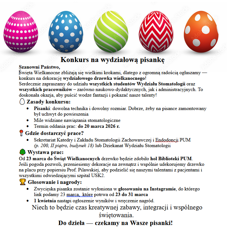 Serdecznie zapraszam do odbycia praktyk wakacyjnych po 3 i 4 roku w Katedrze i Zakładzie Stomatologii Zachowawczej i Endodoncji.