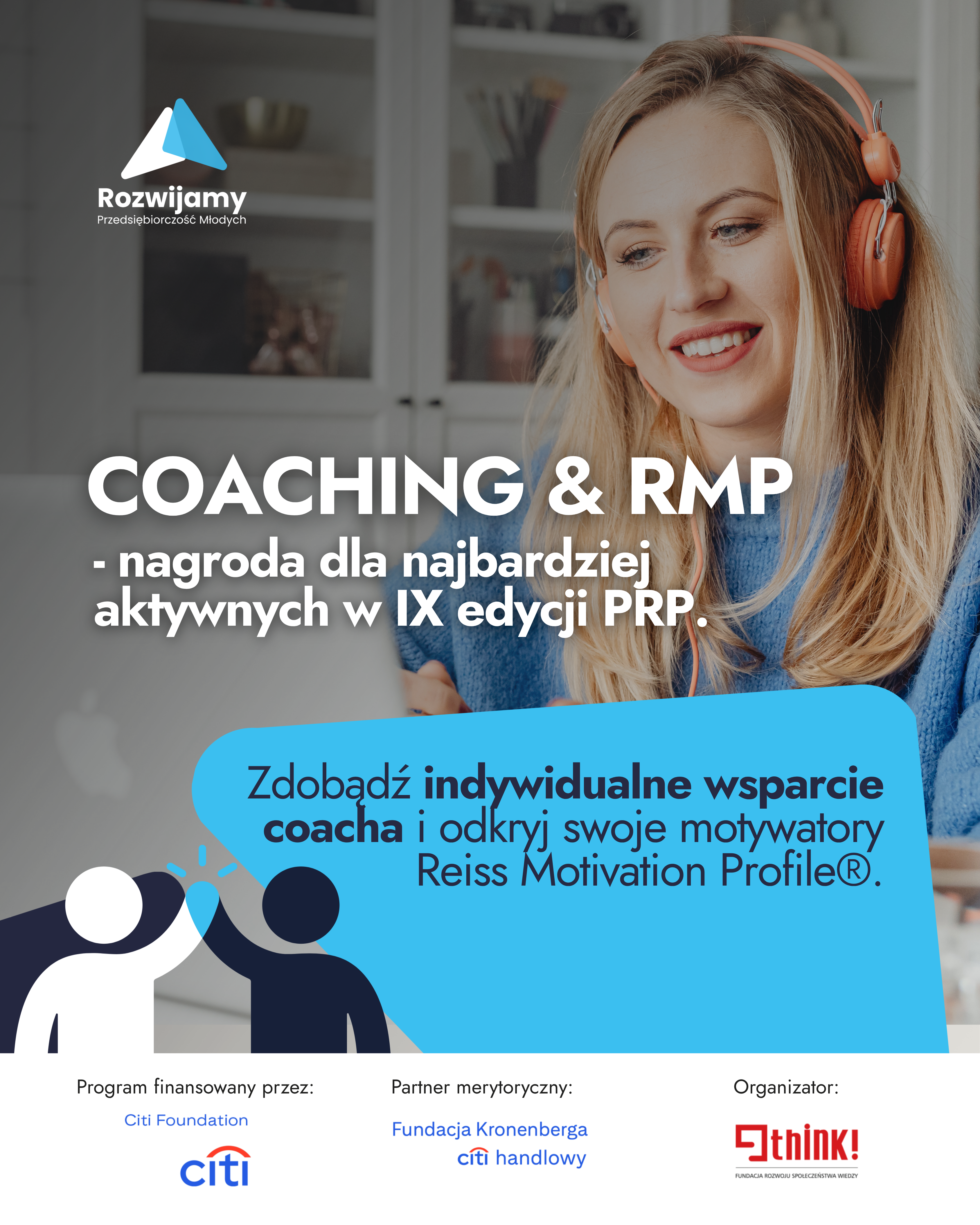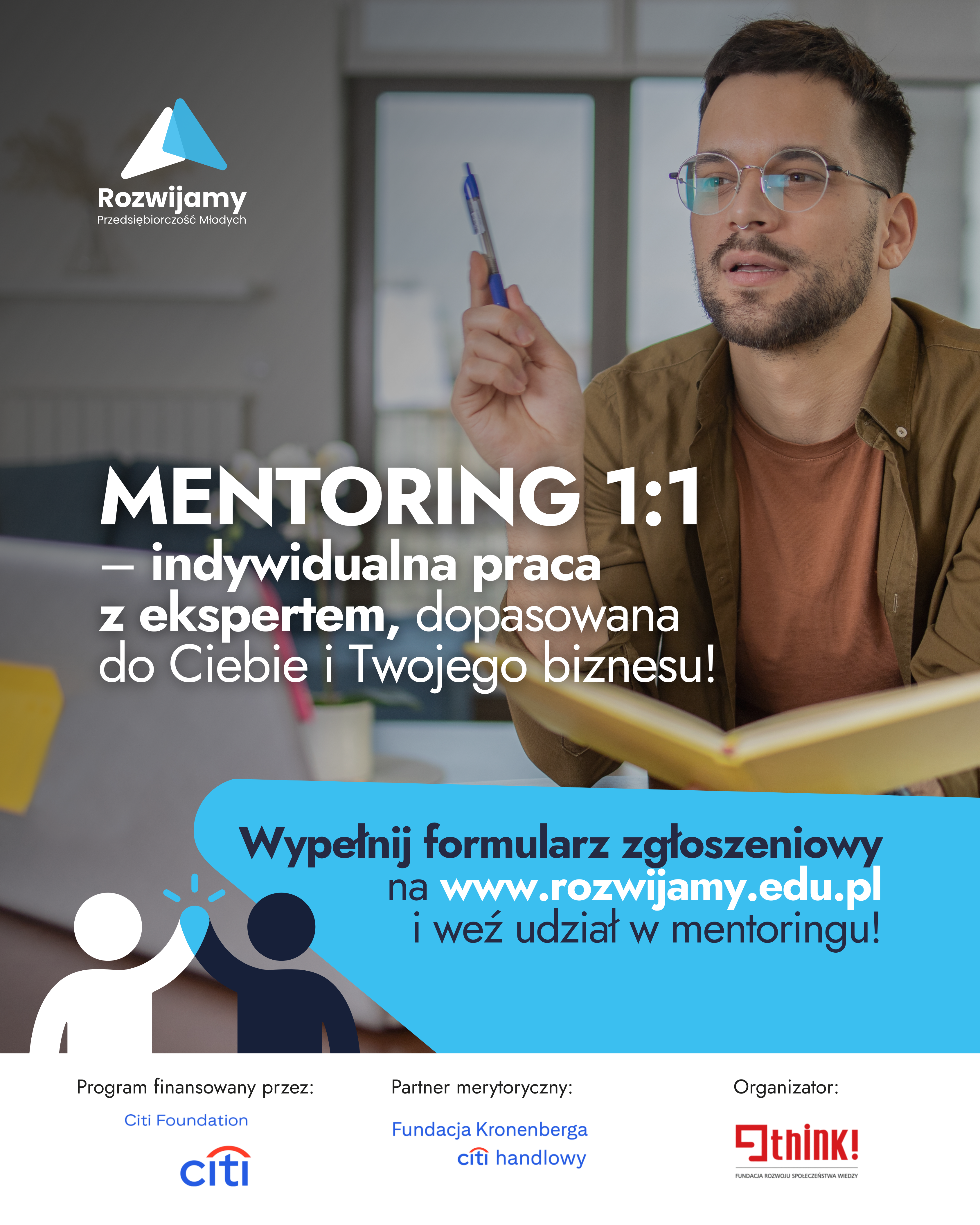 Można skorzystać z bezpłatnego wsparcia w postaci realizacji 2 modułów: Moduły "Mentoring" i "RMP" - to część Programu Rozwoju Przedsiębiorczości finansowanego przez Citi Foundation i realizowanego przez Fundację Think! we współpracy z Fundacją Citi Handlowy.