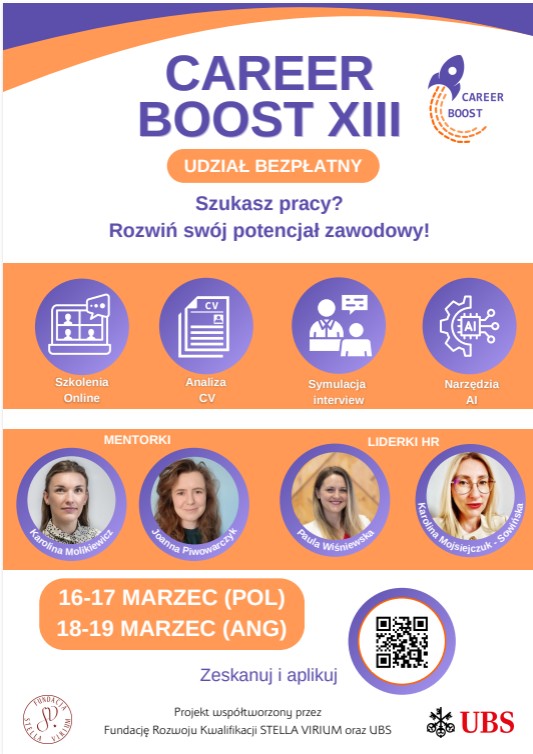 Ruszyła rekrutacja do XIII edycji projektu Career Boost! To okazja do zdobycia nowych umiejętności, które pomogą w procesie rekrutacji i rozwijaniu kariery. W ramach projektu Career Boost mozna skorzystać z: