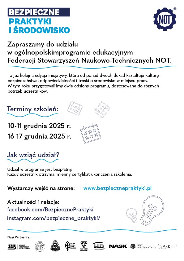 Federacja Stowarzyszeń Naukowo-Technicznych NOT wraz z Partnerami, realizuje Program edukacyjny skierowany do studentów uczelni wyższych. Głównym celem projektu jest upowszechnianie w formie kursów ONLINE wiedzy dotyczącej szeroko rozumianego bezpieczeństwa podczas odbywania praktyk, staży oraz pracy.