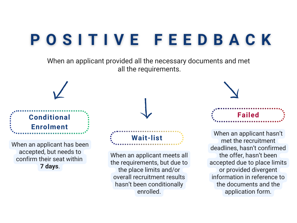 All candidates, who were placed on top of the rank list within the limit, i.e. their rank number does not fall below the max. seats limit (please see STEP 1 for limit breakdown), are offered an admission. Once the registration period closes, above-mentioned candidates have their statuses changed to Conditionally Enrolled and get a notification prompting them to confirm their seat within 7 days. 2. How to become Successfully enrolled