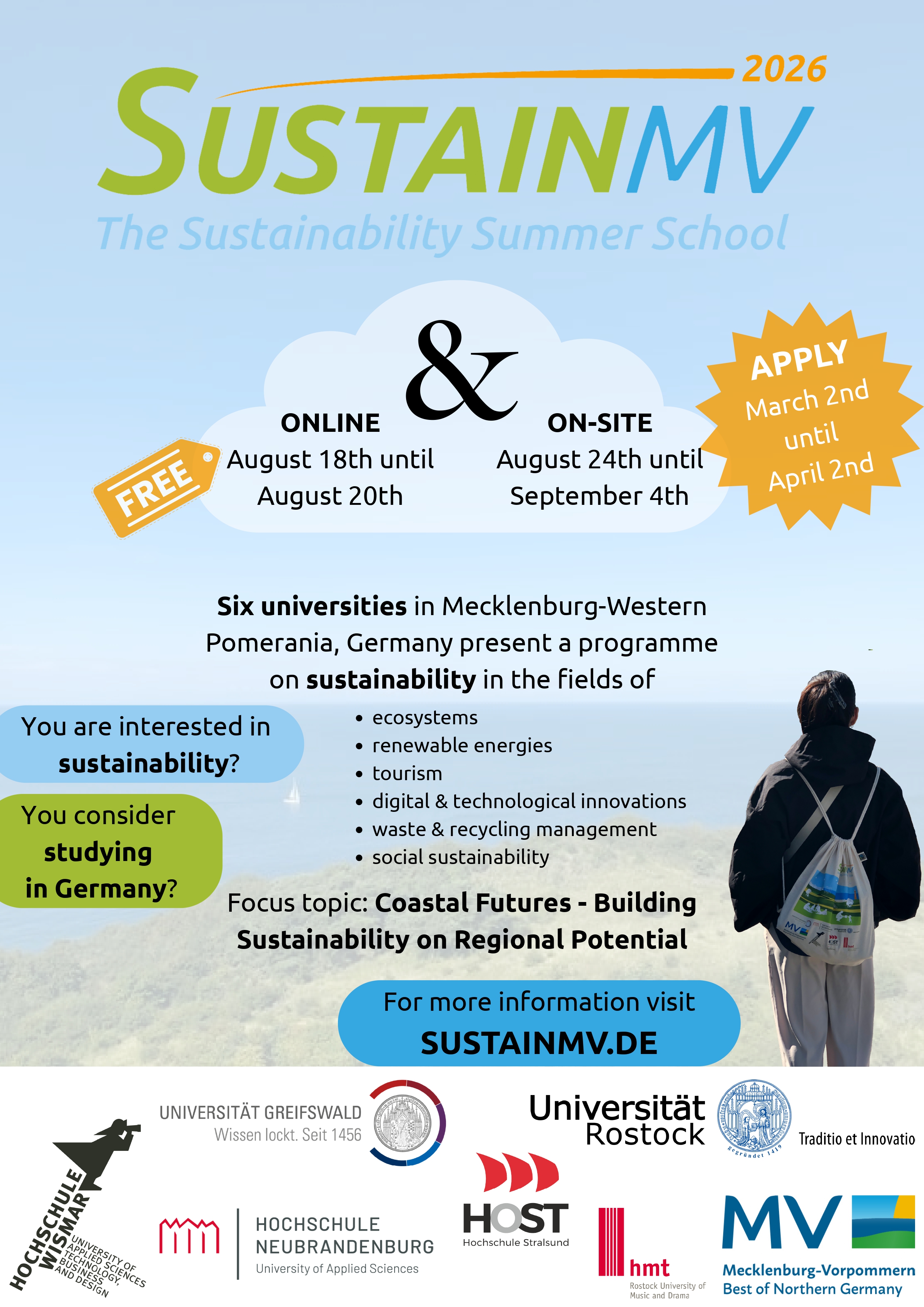 SustainMV – the summer school on sustainability – will take place this year for the sixth time! In the last five years they have welcomed over 1000 participants in online format and nearly 120 on-site in the past four years. Over 60 different speakers presented their scientific perspective on sustainability. This year’s focus topic is: Coastal Futures – Building Sustainability on Regional Potential.