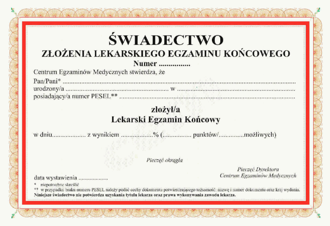 Diploma with the degree of “lekarz” / "lekarz-dentysta" and the diploma supplement