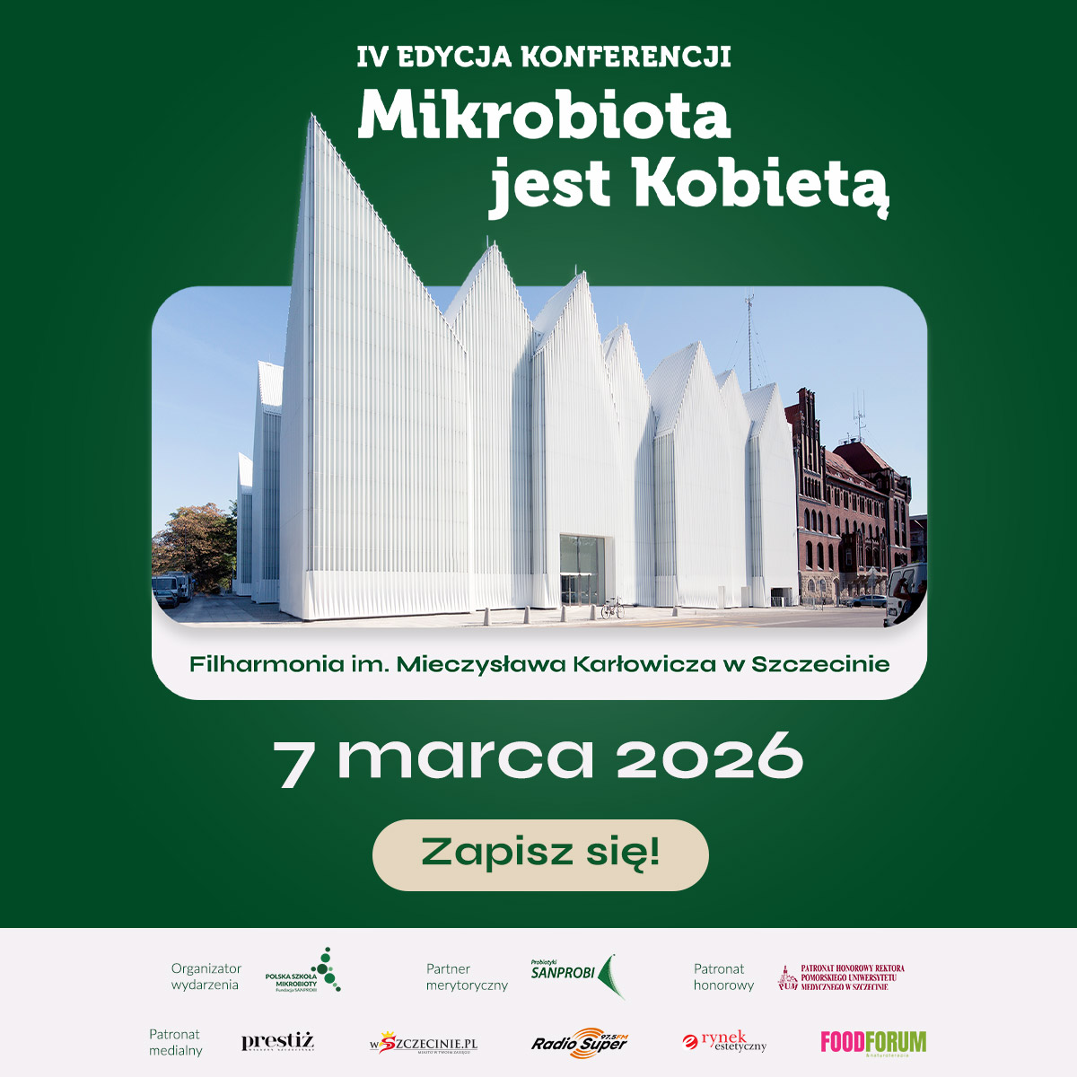 7 marca 2026 r. w Sali Kameralnej Filharmonii im. Mieczysława Karłowicza w Szczecinie odbędzie się IV edycja konferencji „Mikrobiota jest Kobietą”. Wydarzenie zgromadzi ekspertów z zakresu medycyny, dietetyki i nauk o zdrowiu, którzy omówią najnowsze doniesienia dotyczące roli mikrobioty jelitowej w utrzymaniu homeostazy organizmu.