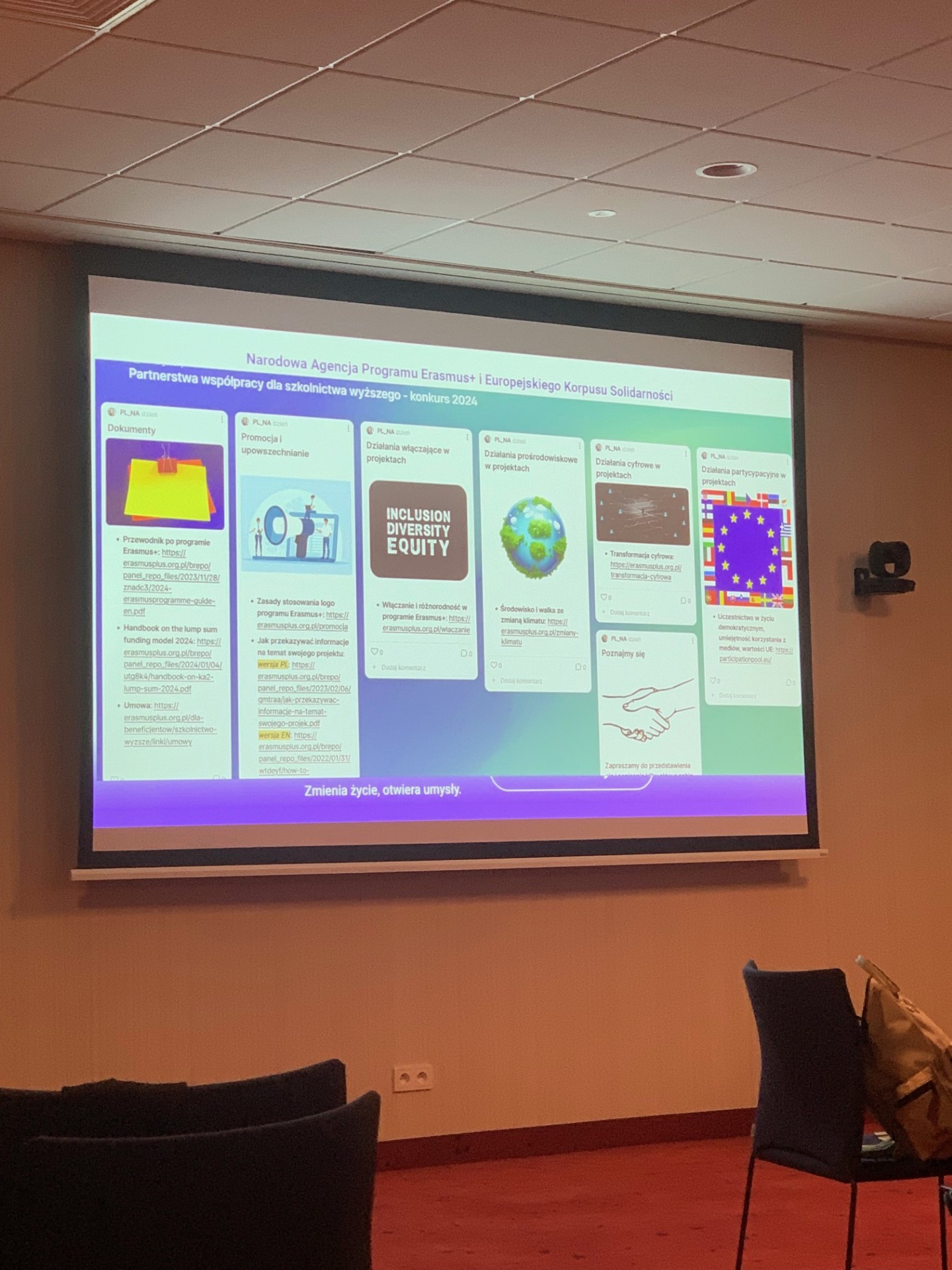 On Thursday, November 14, 2024, part of our management team participated in an introductory training session on implementing Cooperation Partnership projects in the higher education sector, organized as part of the 2024 call. The event took place in Warsaw and provided an excellent opportunity to share a few words about our MultiCultiMed project and learn about initiatives undertaken by other universities.