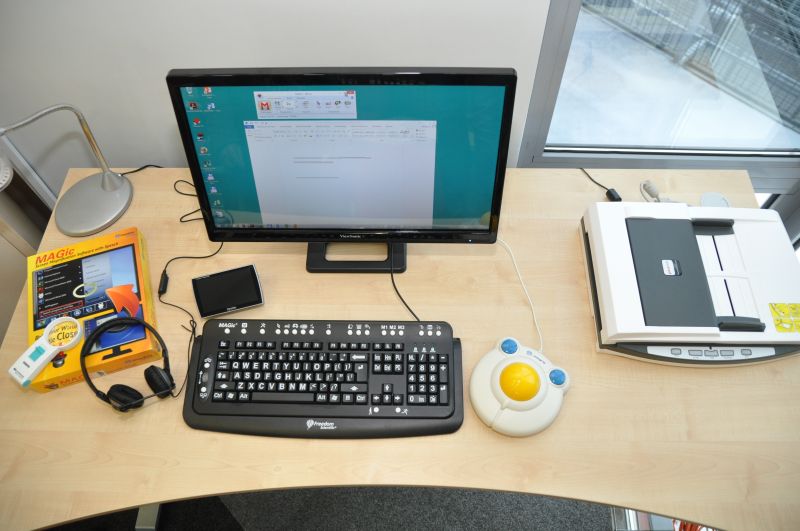 W czytelni Biblioteki Głównej znajduje się stanowisko komputerowe dla czytelników z dysfunkcją wzroku, słuchu bądź z niepełnosprawnością ruchową, składające się z następujących elementów: