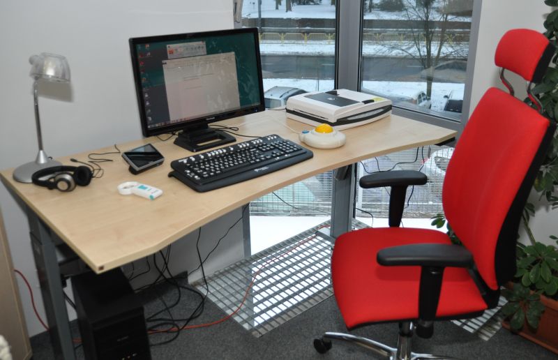 Biurko z elektrycznie regulowaną wysokością umożliwia podnoszenie i opuszczanie blatu z zakresie 680-1200 mm za pomocą przycisku, a specjalistyczne krzesło umożliwia właściwe ułożenie kręgosłupa. Krzesło oprócz profilowania ma ruchome podłokietniki i wygodny zagłówek.