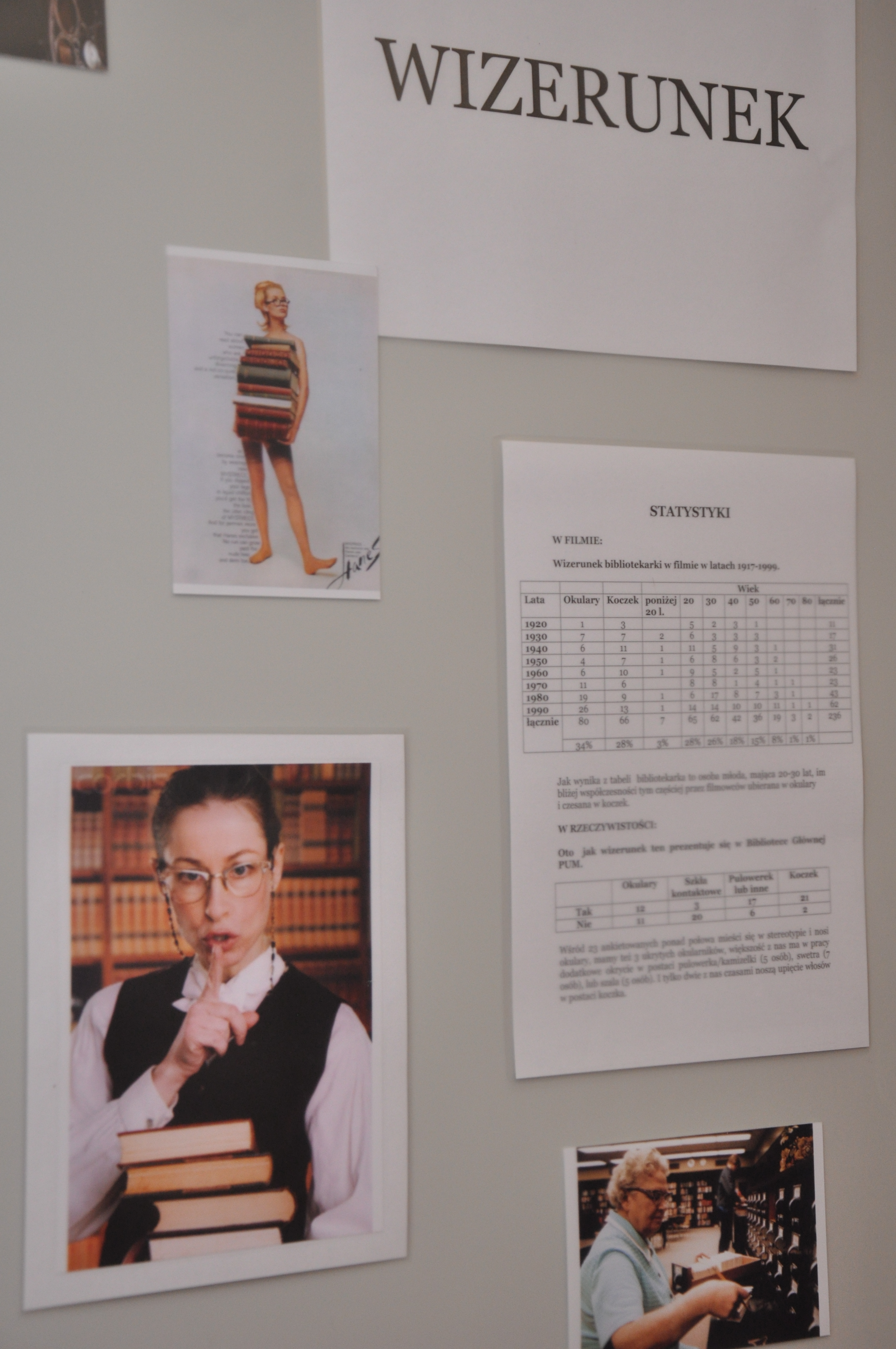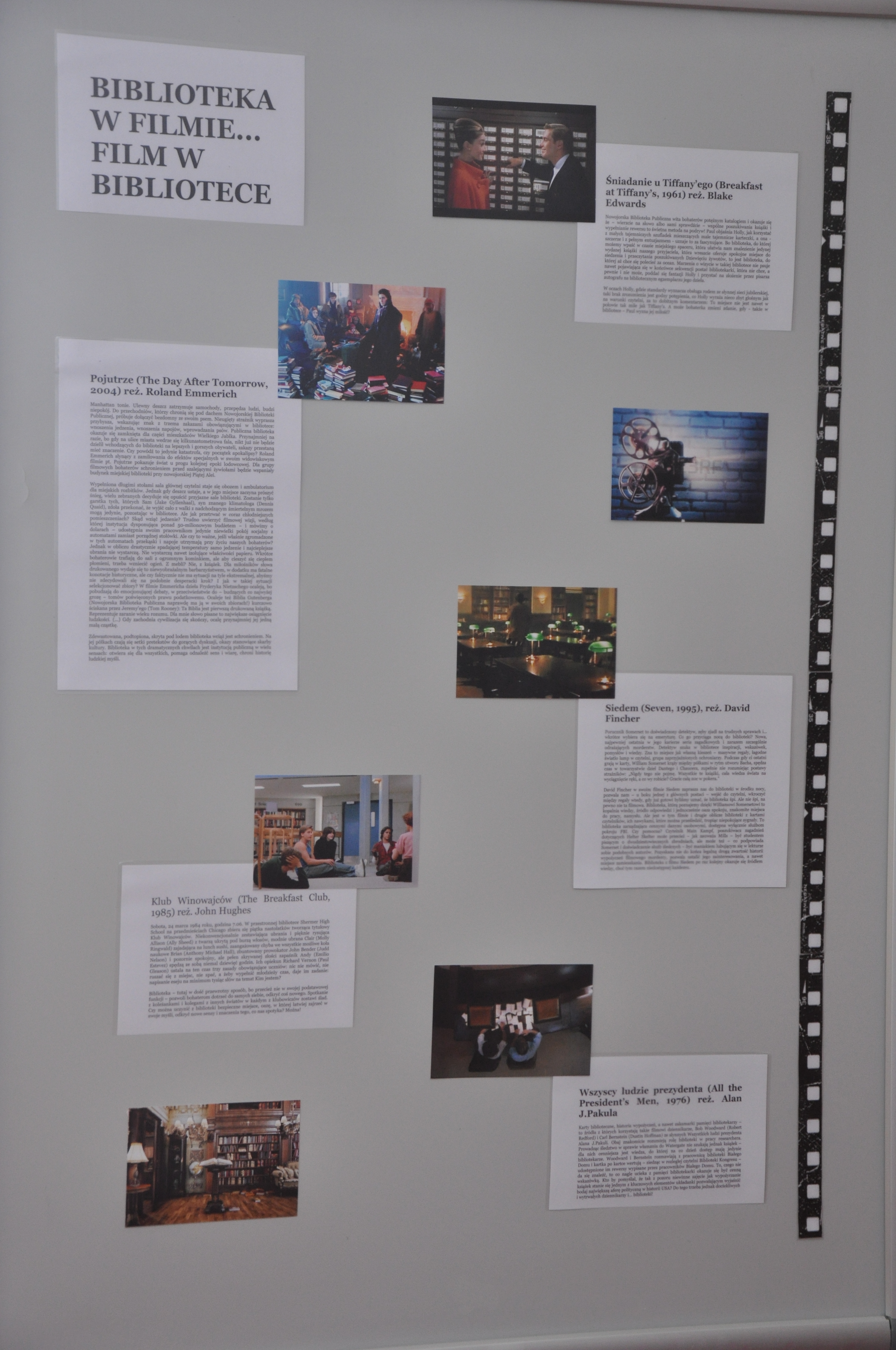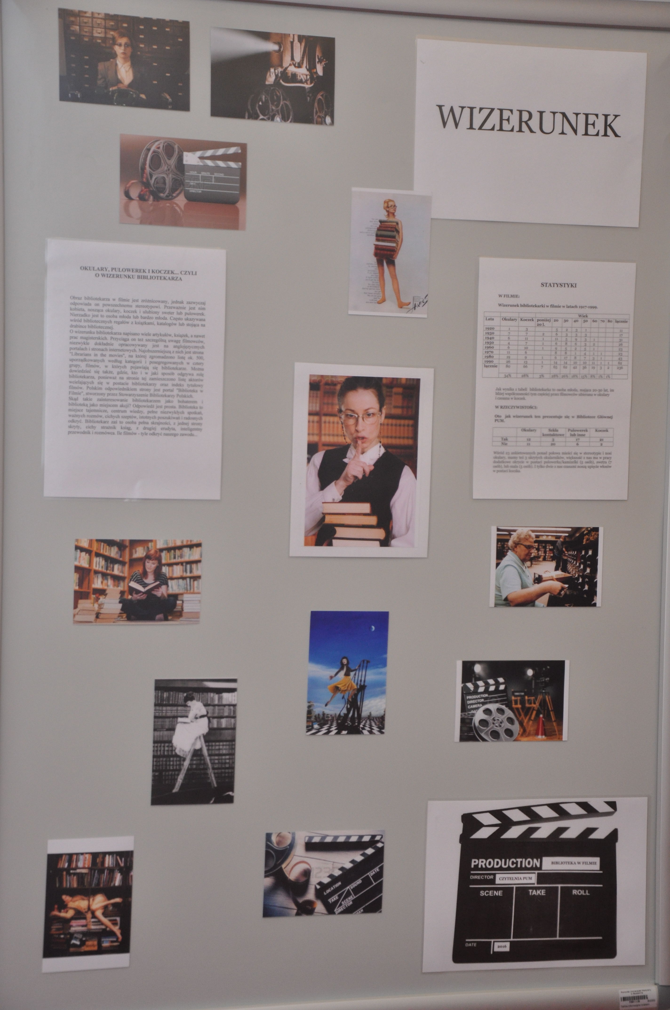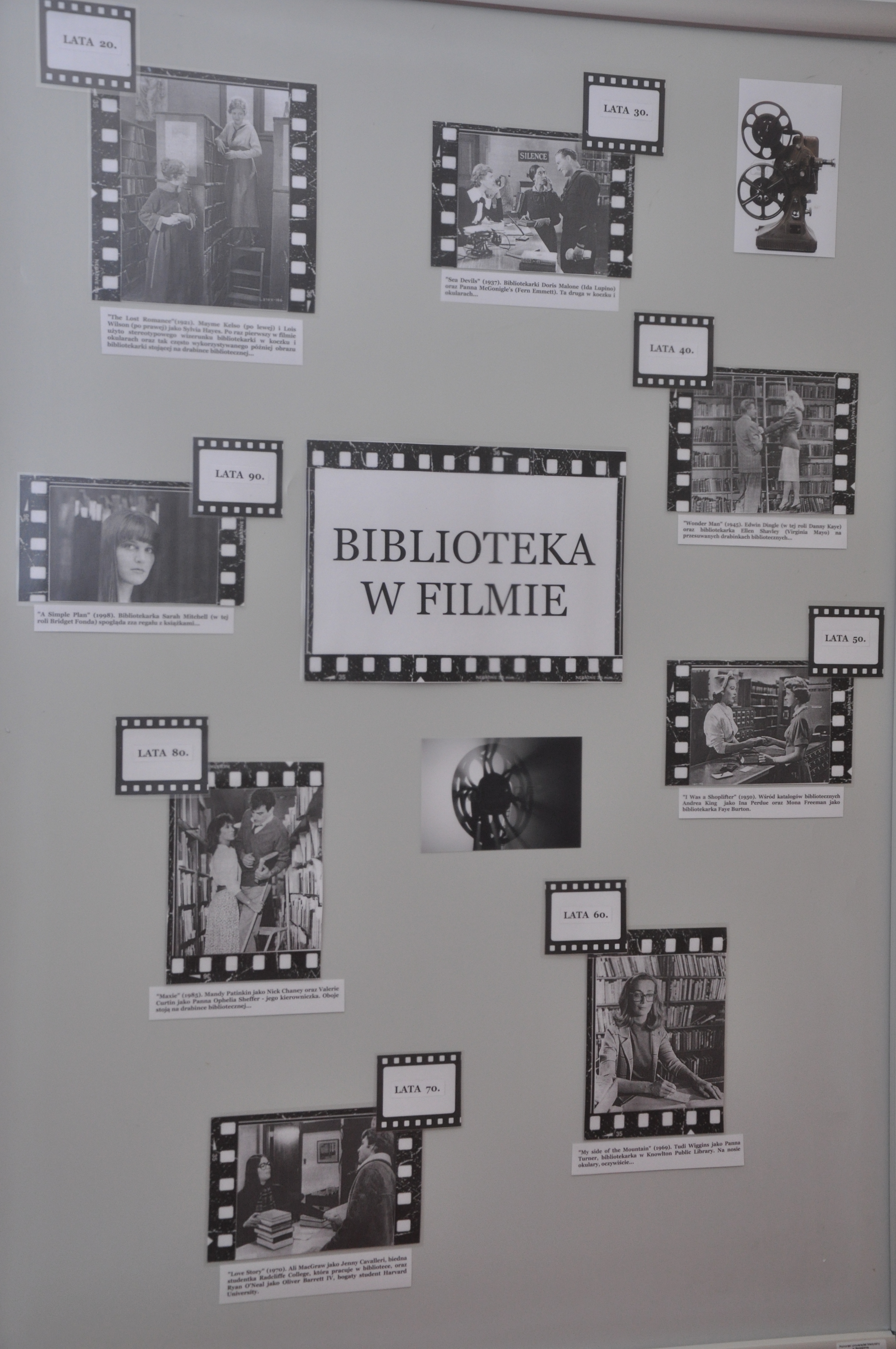 Inspiracją do powstania wystawy „Biblioteka w filmie” stała się książka Ray’a i Brendy Tevis „The image of Librarians in cinema, 1917 – 1999”. Autorki wystawy: Ewa Jarmołowicz, Izabela Górczyńska, Renata Pabisiak przedstawiły nie tylko wizerunek bibliotekarza w filmie, ale również najczęściej towarzyszące mu rekwizyty (drabinka biblioteczna, katalog) oraz skonfrontowały obraz kreowany w filmach z rzeczywistością (stereotypy kontra bibliotekarze PUM). Odwiedzający wystawę mogą również przeczytać o filmach, których akcja toczy się w bibliotece, jak również prześledzić zmiany jakie następowały w postrzeganiu naszego zawodu na przestrzeni lat.