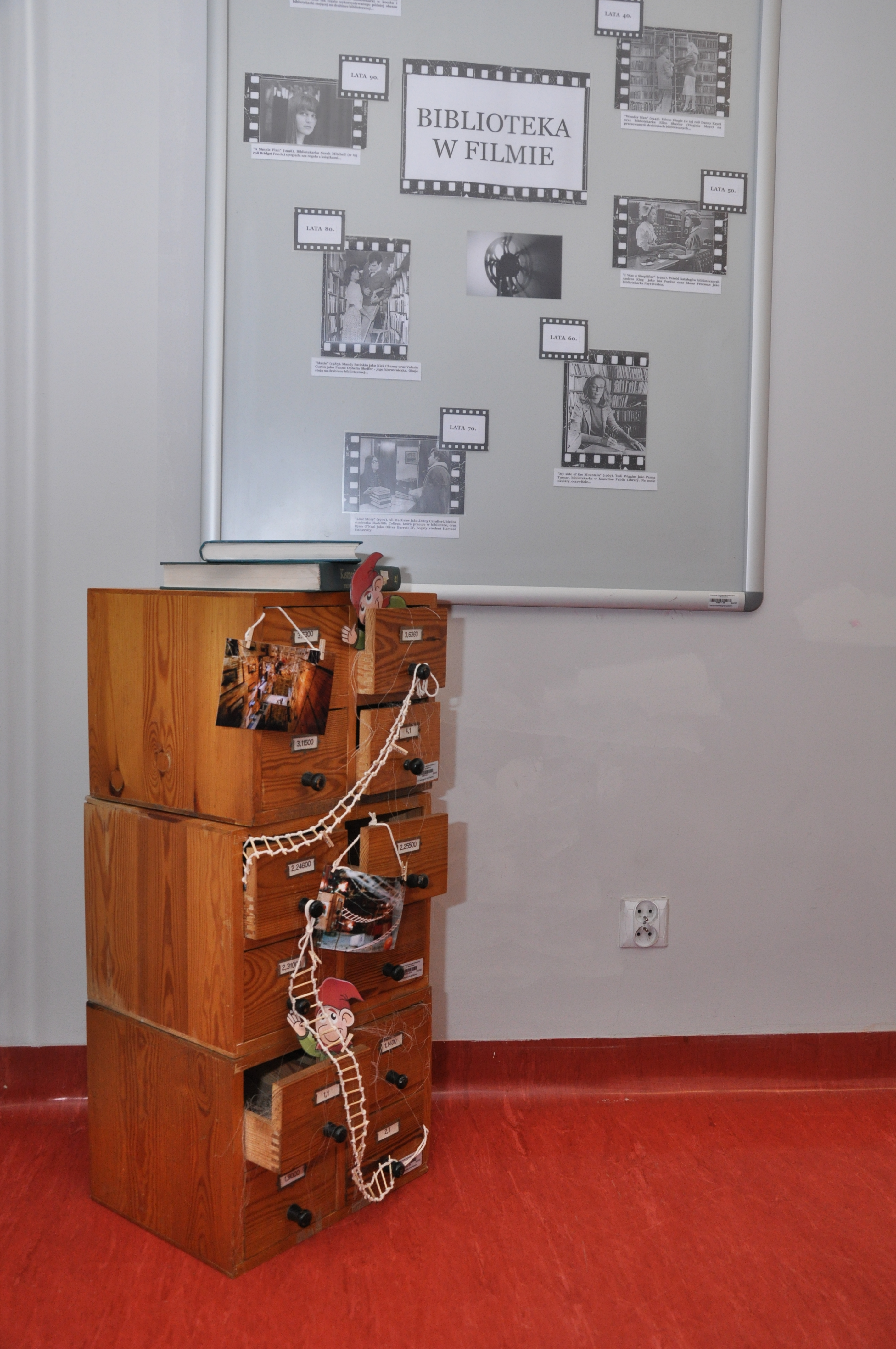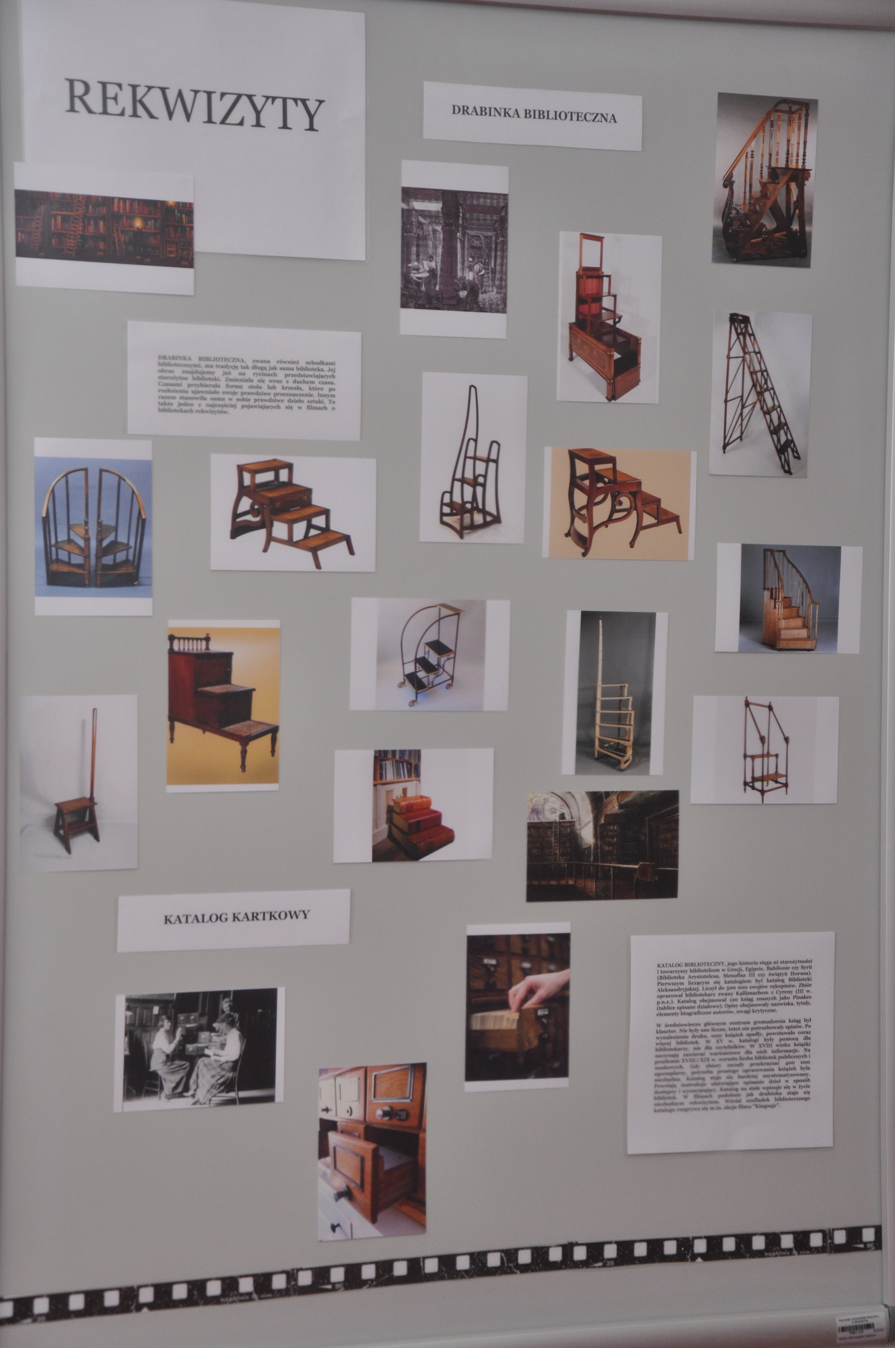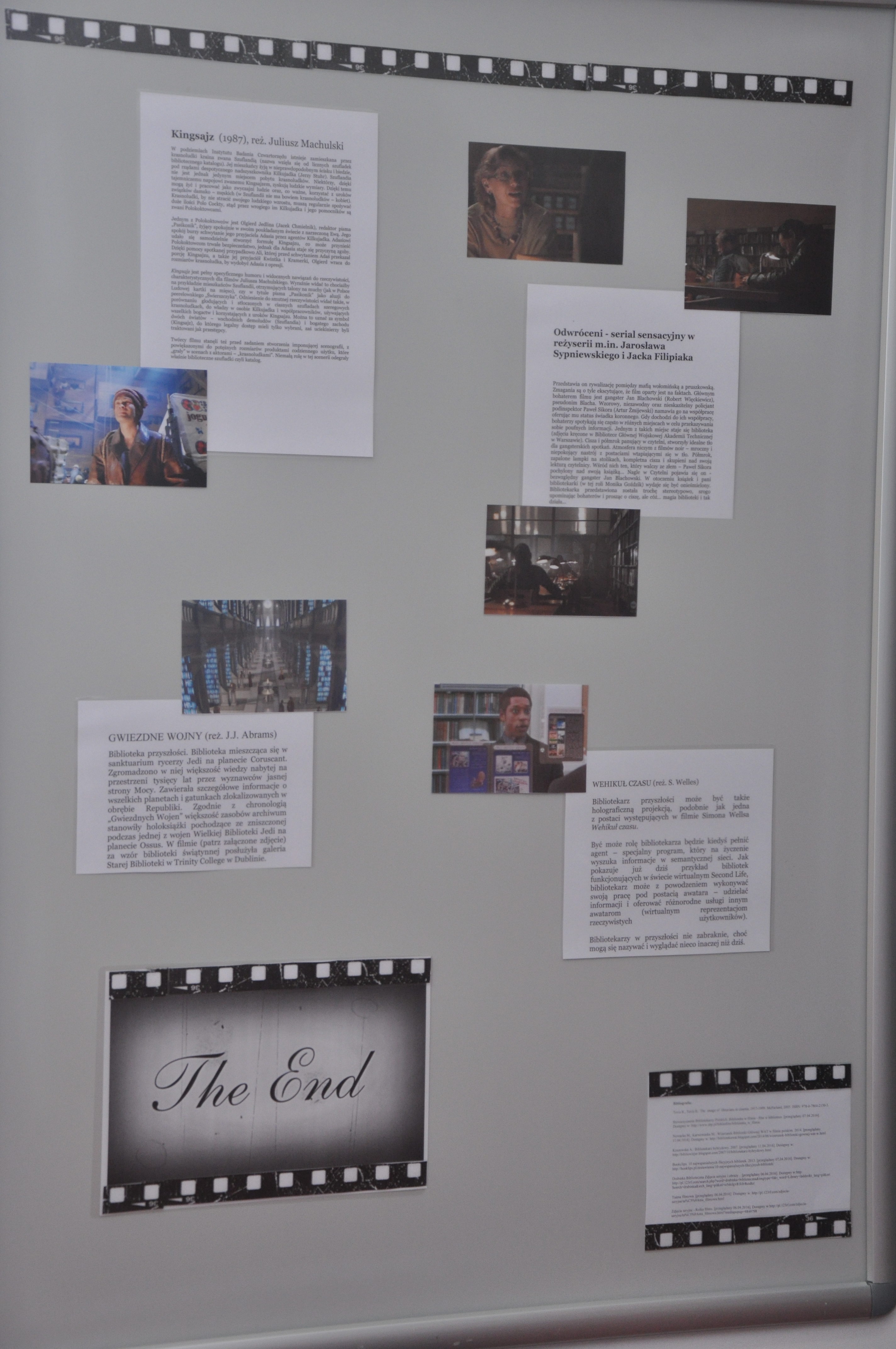 Inspiracją do powstania wystawy „Biblioteka w filmie” stała się książka Ray’a i Brendy Tevis „The image of Librarians in cinema, 1917 – 1999”. Autorki wystawy: Ewa Jarmołowicz, Izabela Górczyńska, Renata Pabisiak przedstawiły nie tylko wizerunek bibliotekarza w filmie, ale również najczęściej towarzyszące mu rekwizyty (drabinka biblioteczna, katalog) oraz skonfrontowały obraz kreowany w filmach z rzeczywistością (stereotypy kontra bibliotekarze PUM). Odwiedzający wystawę mogą również przeczytać o filmach, których akcja toczy się w bibliotece, jak również prześledzić zmiany jakie następowały w postrzeganiu naszego zawodu na przestrzeni lat.